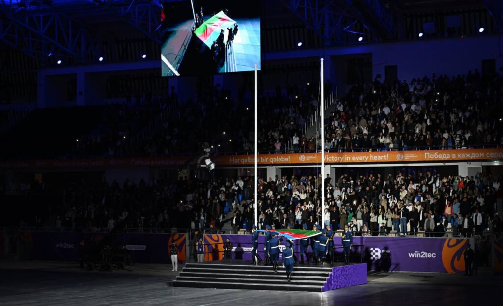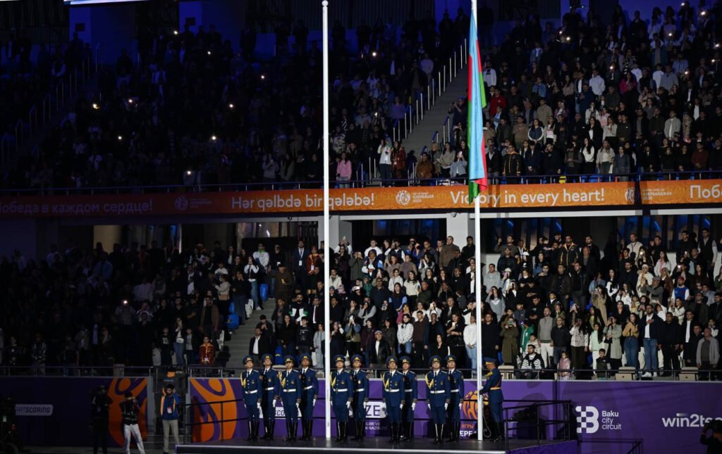 Əvvəlcə Azərbaycan Respublikasının üçrəngli Bayrağı arenaya gətirilib və Dövlət Himnimizin sədaları altında ucaldılıb.