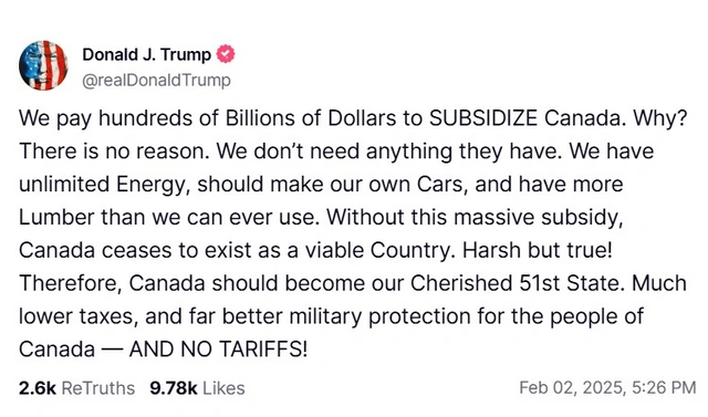 "Kanadaya subsidiya vermək üçün yüz milyardlarla dollar ödəyirik. Nə üçün? Heç bir səbəb yoxdur. Onların heç nəyinə ehtiyacımız yoxdur", – o yazıb.
