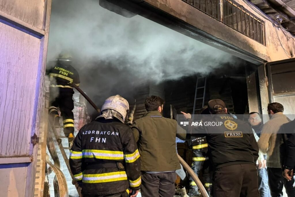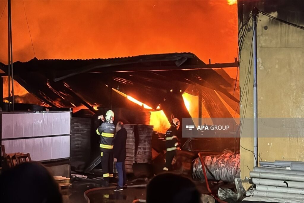 APA-nın əməkdaşı hadisə yerindən xəbər verir ki, sahibkarlar mallarını yanğın baş verən ərazidən çıxarırlar.