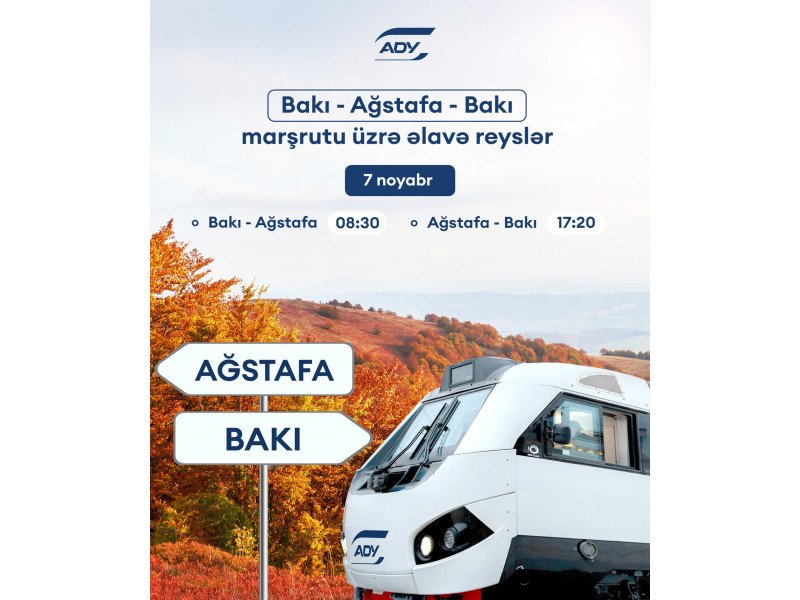 "Azərbaycan Dəmir Yolları" QSC (ADY) artan sərnişin tələbatını təmin etmək məqsədilə 7 noyabrda Bakı-Ağstafa-Bakı istiqamətində əlavə qatar reysləri təyin edir.